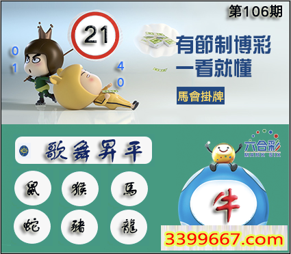 106期正版彩图挂:21 爆:牛 挂牌成语:歌舞升平 挂牌出肖:鼠猴马蛇猪龙