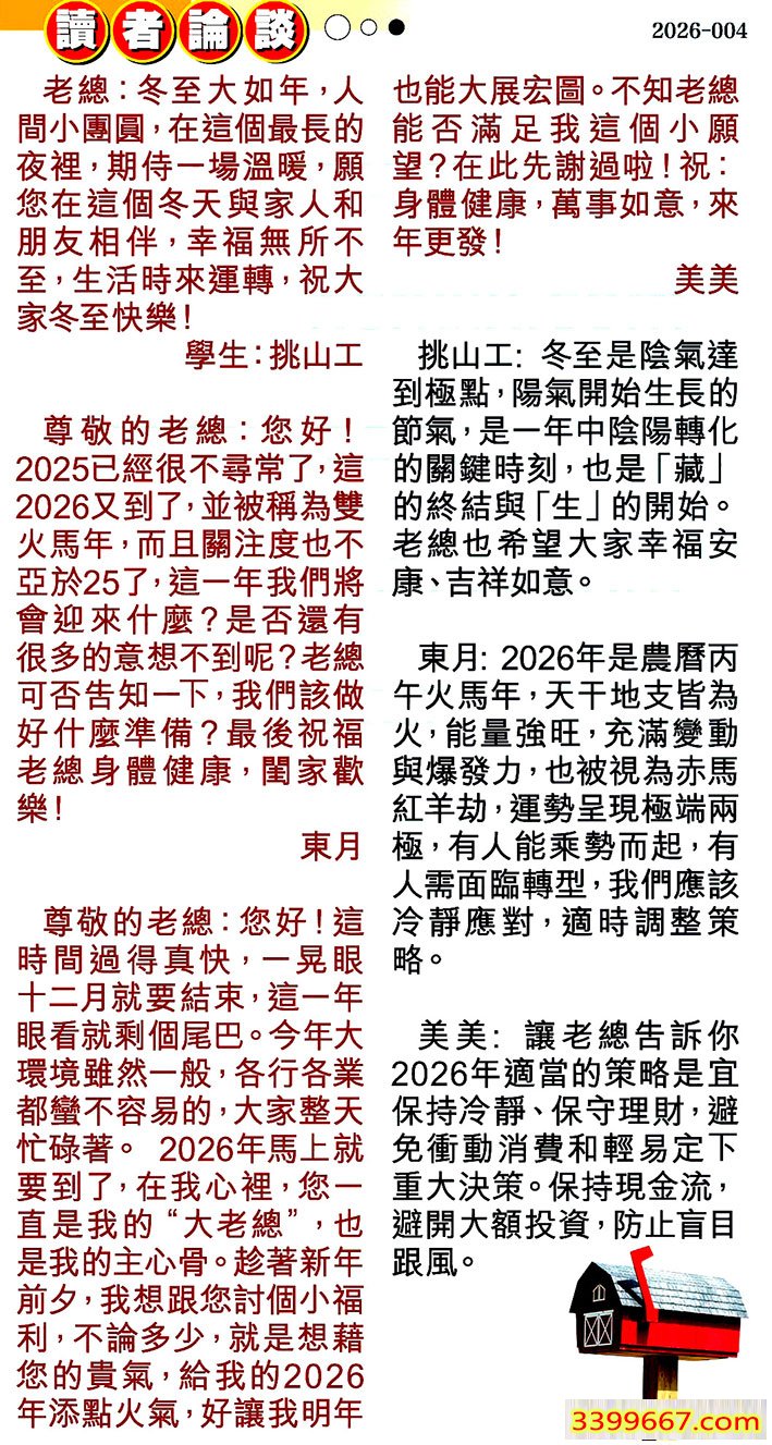 2.尊敬的老總:您好!2025已經很不尋常了,這2026又到了,並被稱為雙火馬年,而且關注度也不亞於25了,這一年我們將會迎來什麼?是否還有很多的意想不到呢?老總可否告知一下,我們該做好什麼準備?最後祝福老總身體健康,閏家歡樂!====東月