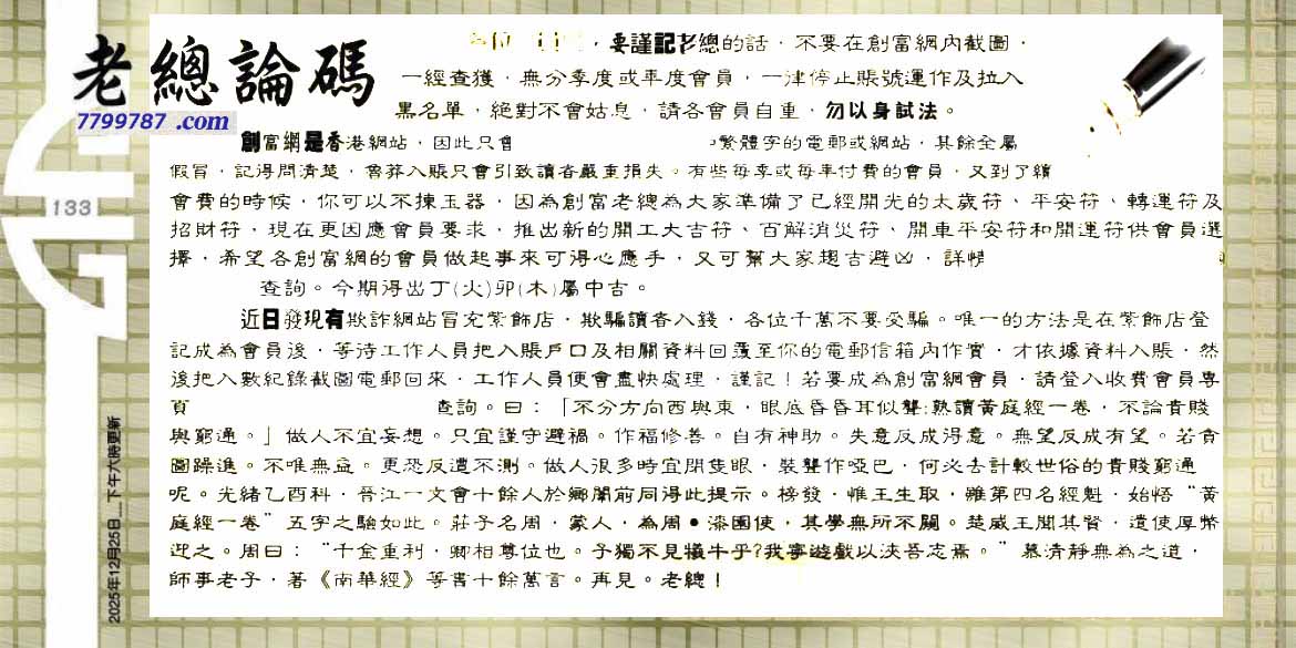 133期:六合皇金句/老总论码/萧公子/林大师/五行夺码/老总信箱截