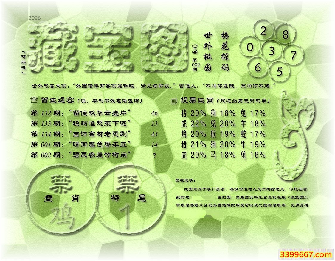 002期藏寶圖 新:行子不须愁夜泊 老:碧瓦参差竹树闲 禁:鸡 禁:1尾